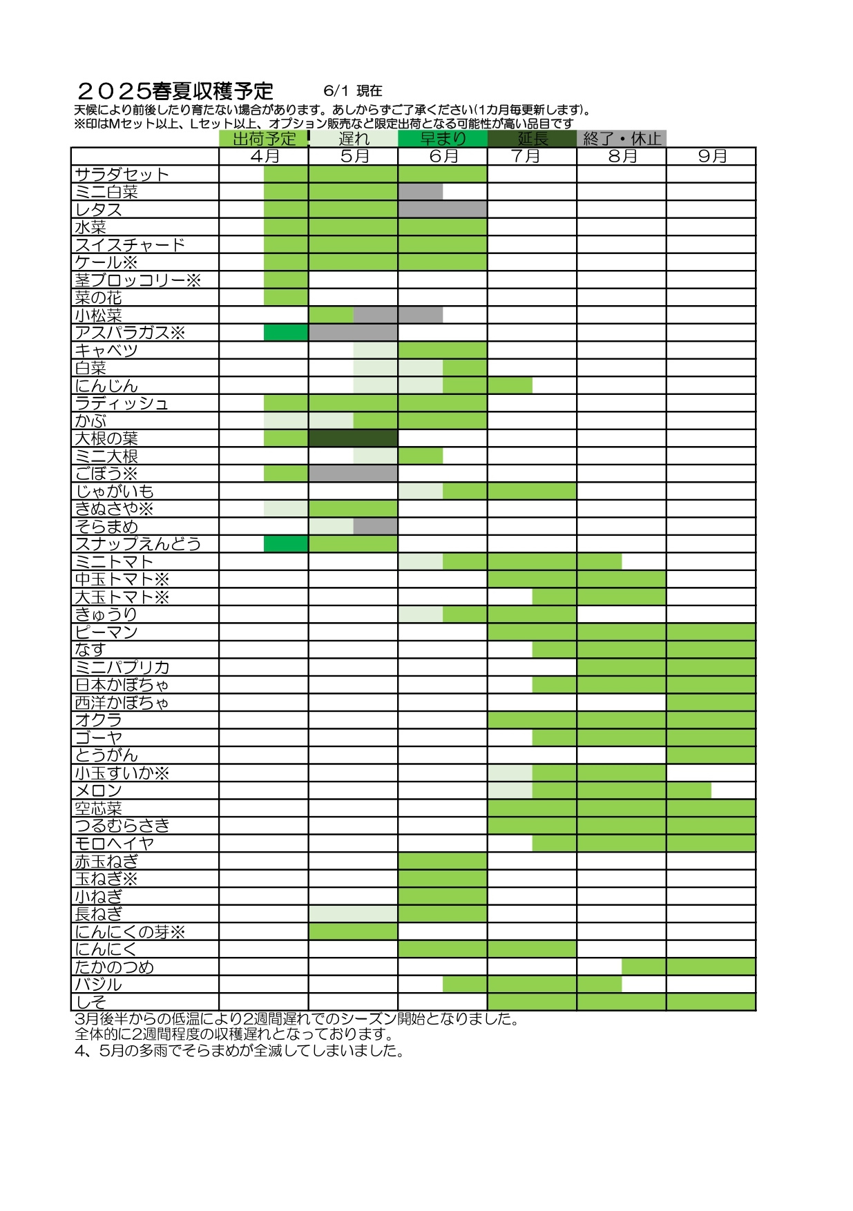 生らっかせい、さつまいも、とうがん、空芯菜、ピーマンセット、マイラブサラダセット、かぼちゃ、つるむらさきの8品+おまけ1品(天候や生育の状況により一部変更になる場合があります)。