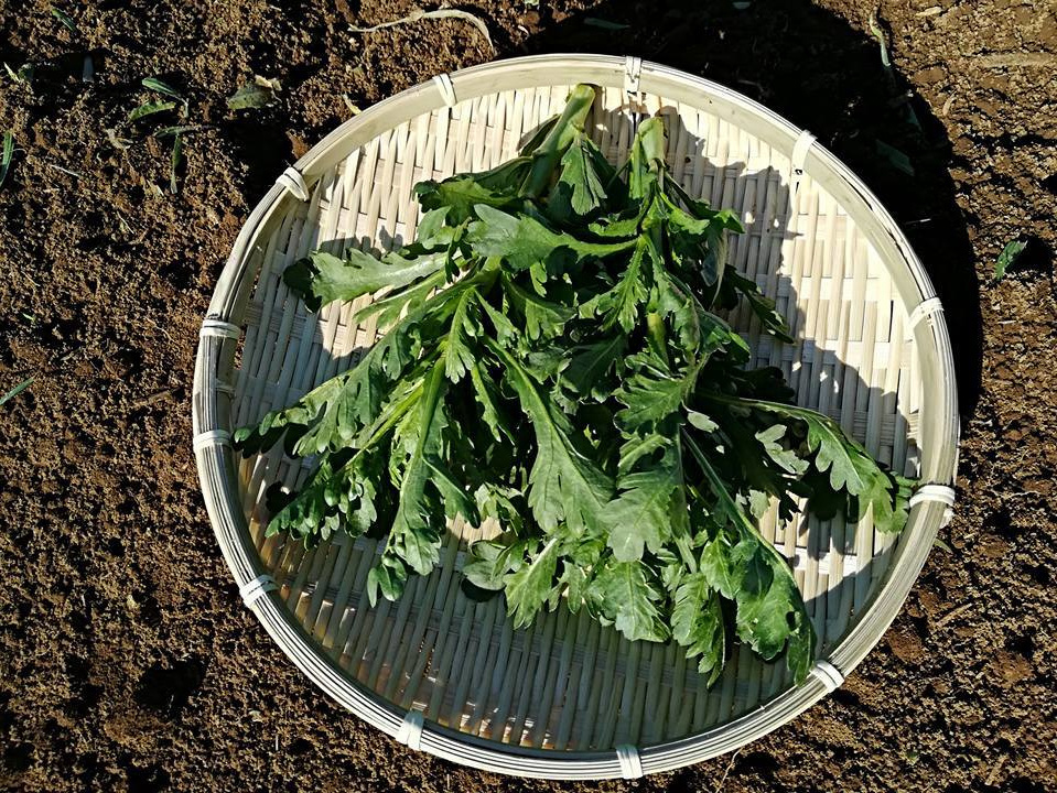 希少な固定種春菊。鼻抜け抜群の香味で鍋、汁物に最適。生食も出来、サラダに力発揮。
