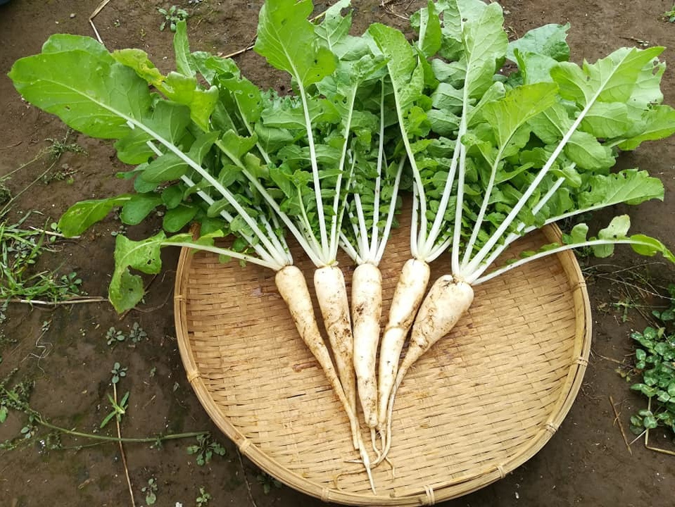 東京葛飾で発祥の伝統大根。小さいながら滋味たっぷりの濃い味。根と葉一緒に味噌汁が最高。根は漬物や煮物、葉は炒め物やおひたしにも。