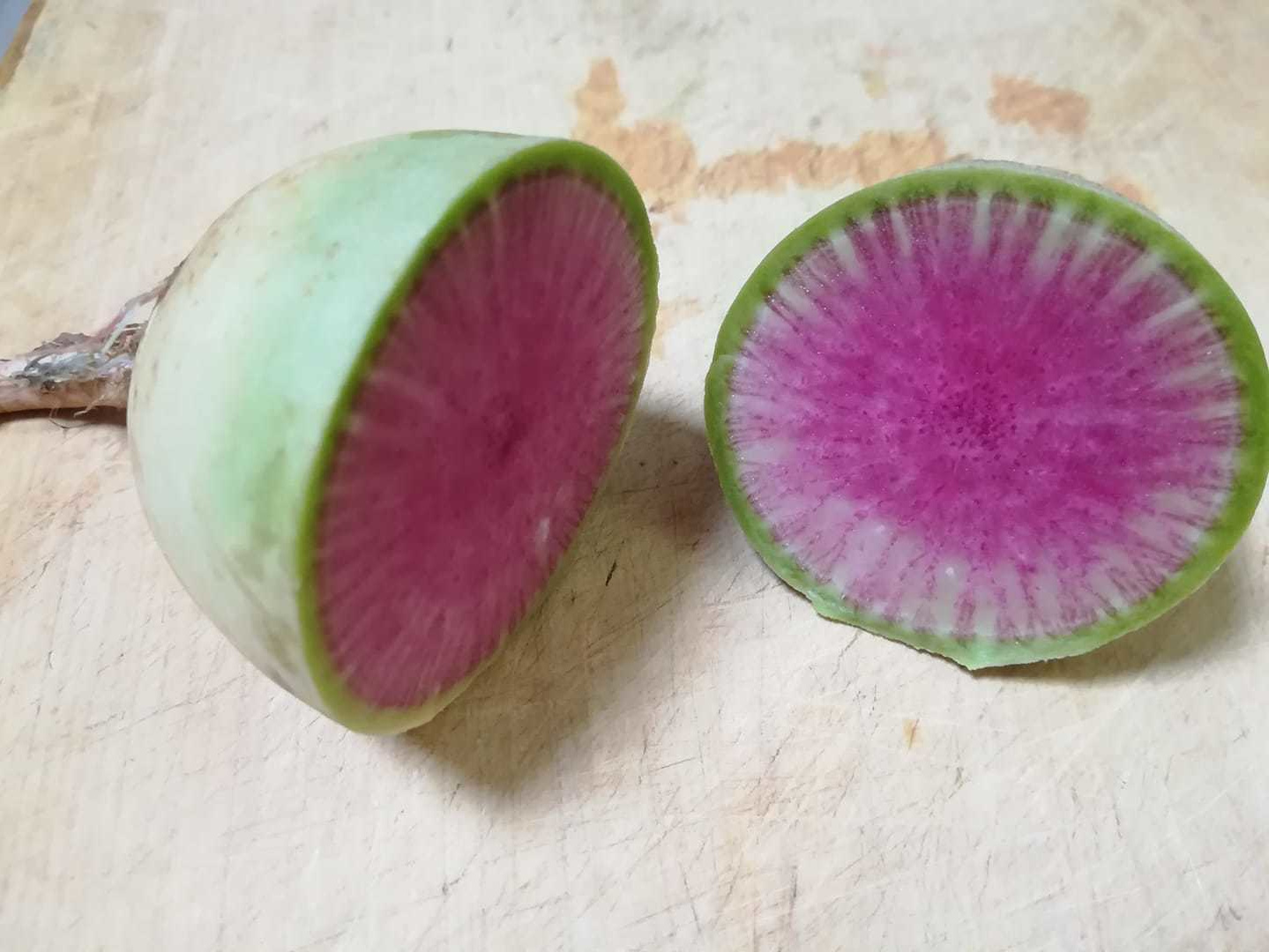 鮮やかな紅色の小型大根。ピリッと辛く、生で薄くスライスしてサラダの彩りにしたり酢漬けに最適。